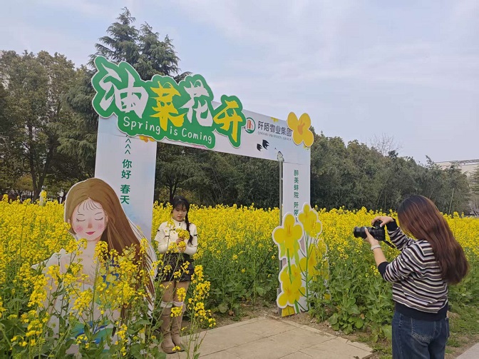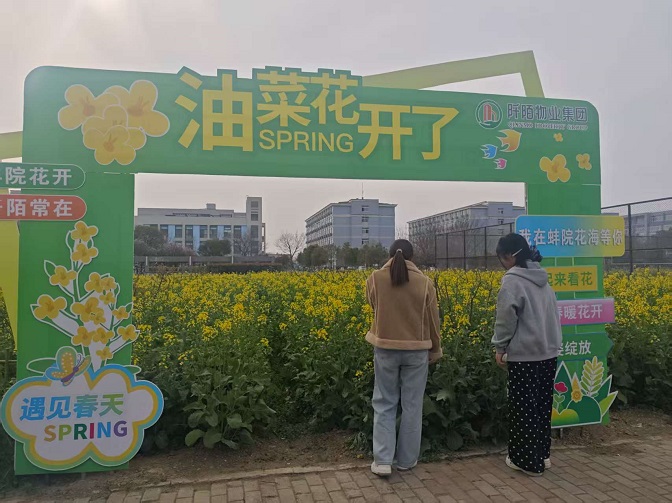 从闲置地块到金色花田,以自然为笔,用数月的精细化养护,让每一株油菜都在春日里肆意生长。连片的金黄在阳光下翻涌,与校园的楼宇、绿树相映成趣,风过处,花香漫溢,成为师生们课间漫步、治愈身心的诗意角落,让校园在春日里焕发勃勃生机。为定格这份春日美好,我们匠心打造了 “油菜花开了” 等主题网红打卡点,将“我在蚌院花海等你”、“遇见春天”的温柔期许,融入每一处设计。师生们驻足花田,在镜头里定格青春与春光,让校园不仅是学习的园地,更成为承载浪漫与回忆的打卡胜地。